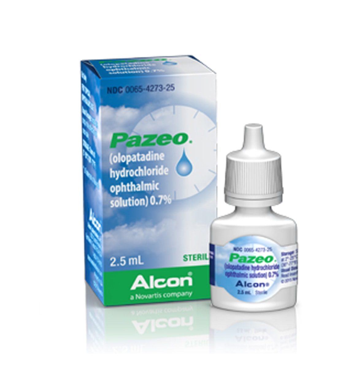 Prescription ophthalmic olopatadine (Pazeo) and nonprescription ophthalmic olopatadine (Pataday) are used to relieve itchy eyes caused by allergic reactions to pollen, ragweed, grass, animal hair, or pet dander. Olopatadine is in a class of medications called mast cell stabilizers. It works by preventing the release of substances that cause eye itching.
