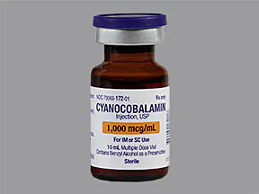 Cyanocobalamin injection is used to treat and prevent a lack of vitamin B12 that may be caused by any of the following: pernicious anemia (lack of a natural substance needed to absorb vitamin B12 from the intestine); certain diseases, infections, or medications that decrease the amount of vitamin B12 absorbed from food; or a vegan diet (strict vegetarian diet that does not allow any animal products, including dairy products and eggs). Lack of vitamin B12 may cause anemia (condition in which the red blood cells do not bring enough oxygen to the organs) and permanent damage to the nerves. Cyanocobalamin injection also may be given as a test to see how well the body can absorb vitamin B12. Cyanocobalamin injection is in a class of medications called vitamins. Because it is injected straight into the bloodstream, it can be used to supply vitamin B12 to people who cannot absorb this vitamin through the intestine.